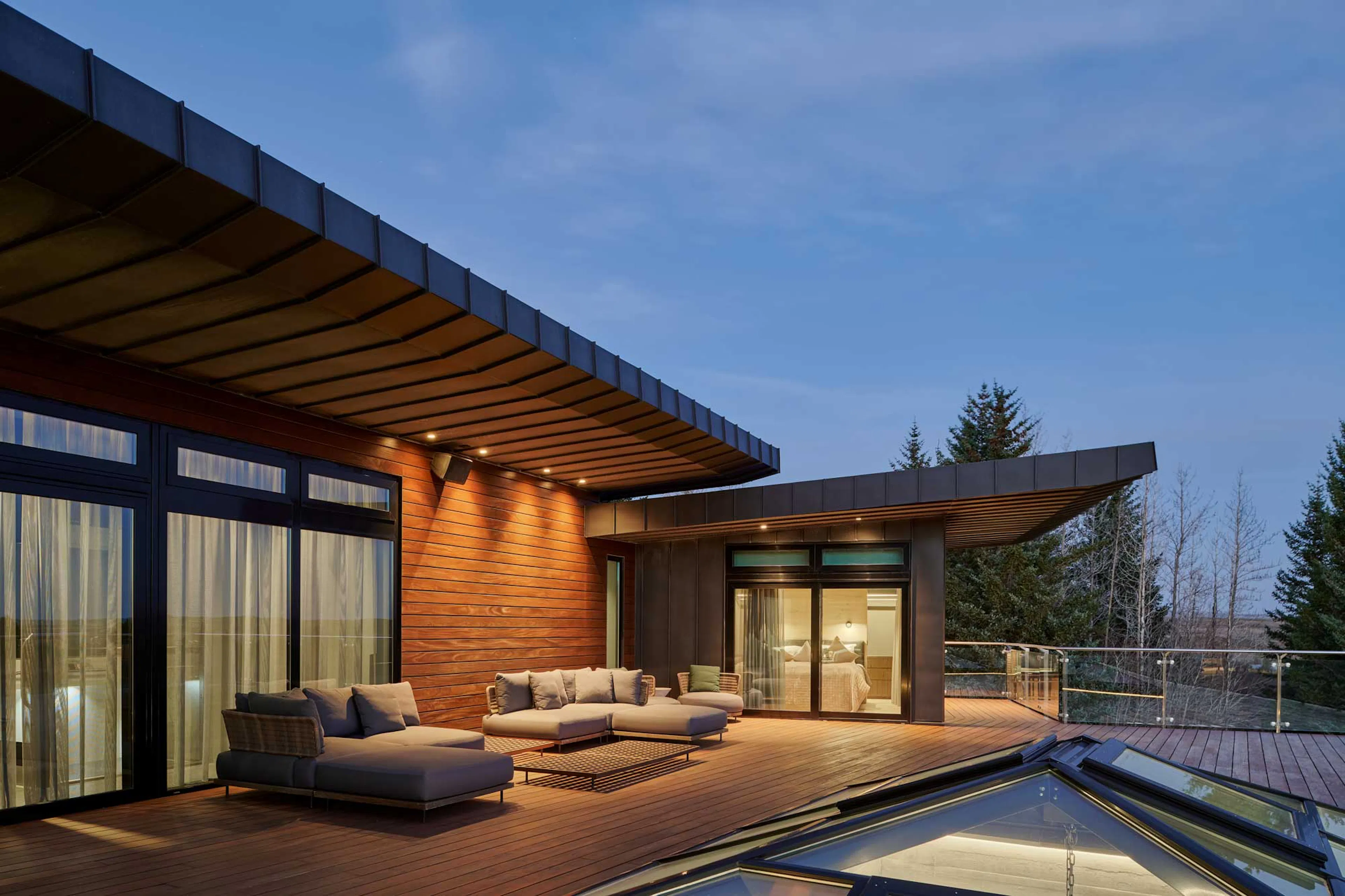 The living room is a bright, inviting space designed for relaxation, with premium seating and large windows that flood the room with natural light and showcase Iceland’s surrounding landscape.